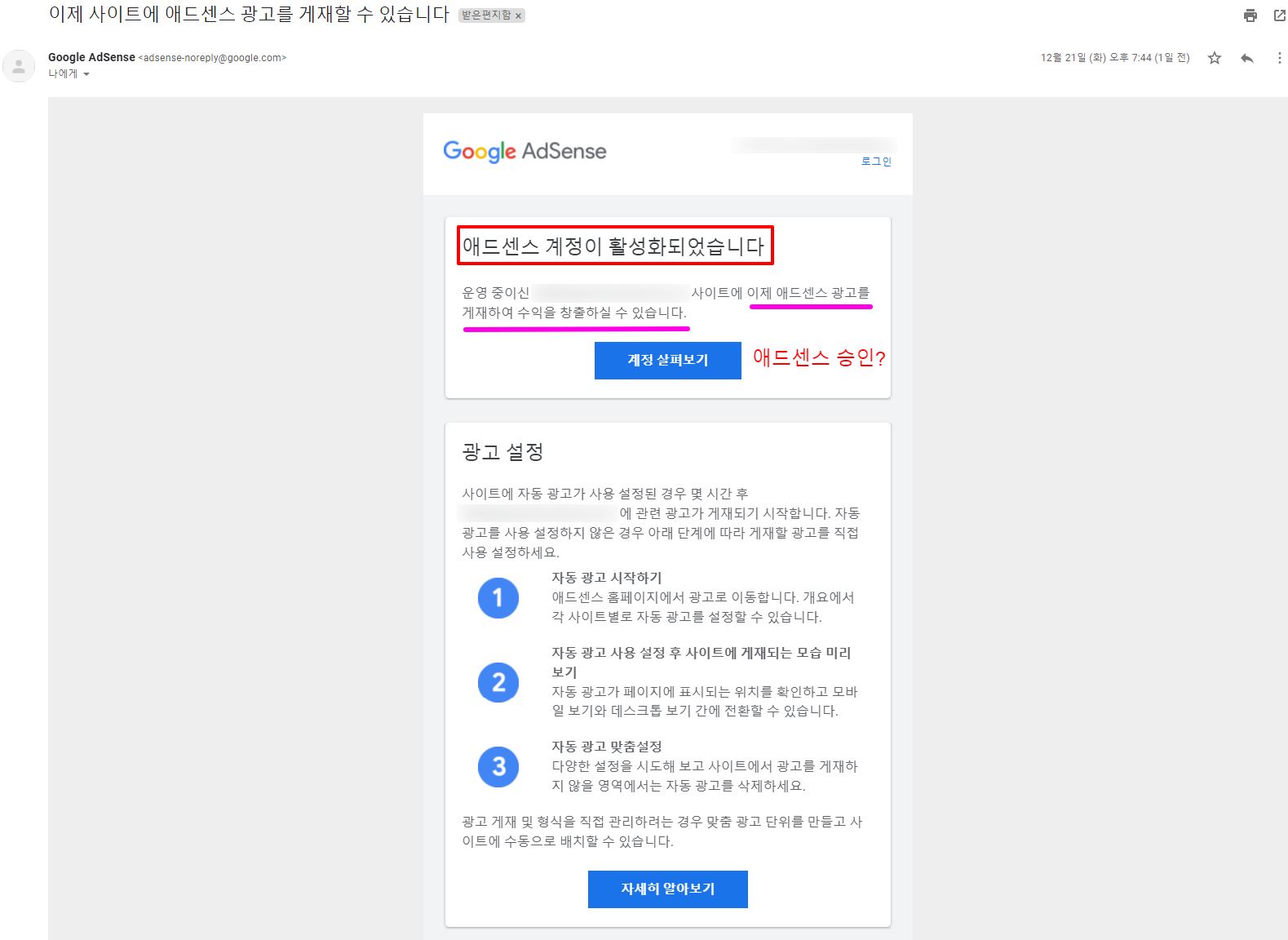 구글 애드센스에서 보낸 메일이 보였습니다.